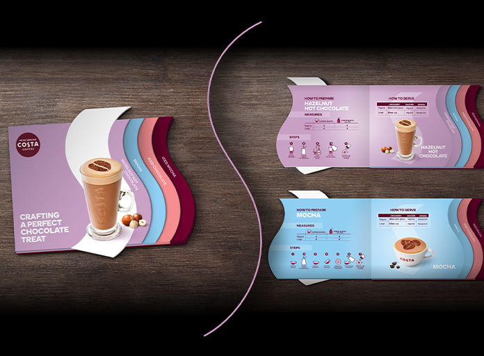 Edukuj swoich klientów na temat dostępnych napojów Costa Coffee i zachęcaj do zakupu poprzez atrakcyjną ofertę, wykorzystującą silny branding na ladach, widoczne panele menu oraz interaktywne treści na ekranach dotykowych w naszych samoobsługowych ekspresach do kawy.